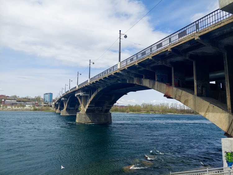 Кстати, уезжая через неделю, мы застали яблоневый цвет и в Иркутске. Получилось забавно в этом году: мы повстречали три цветочные весны. Сначала в Воронеже, потом через пару недель дома, а теперь и здесь. Путешественникам доступна машина времени!Всегда, в любом городе мы в первую очередь стремимся выйти на набережные. В Иркутске хороших просторных прогулочных набережных — две, но они по плохой традиции российских городов отделены друг от друга грязной промзоной. Зато мост красивый. Пролёты!