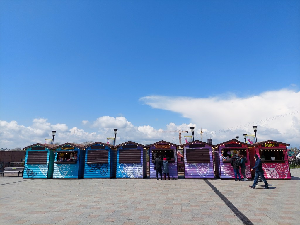 А он — историческое подтверждение того, что ТЗ исполнителям нужно давать максимально точно. Ошибка, вовремя не исправленная, а теперь попавшая во всю геральдику города. Изначально на гербе города был задуман амурский тигр, держащий в зубах соболя — вполне себе местные животные (ну если опустить момент, что тигр в природе навряд ли охотится на мелких и юрких соболей — не его размера добыча). Для официального утверждения и внесения в каталоги нужно было нарисовать герб особо красиво, и безымянный городской чиновник на словах дал задание безымянному же художнику-исполнителю, использовав жаргонное (сугубо сибирское) словечко баабыр, которое в этих местах собственно тигра амурского и обозначает. Только вот художник явно был неместный, и записал для себя как понял: «На гербе нарисовать бобра, держащего в зубах горностая». Создал эскиз, показал знакомым — те схватились за животики. Ты чего мол, дурак, на гербе тигр должен быть! Как же так? Художник впал в ступор. Начальство заказало бобра, а все вокруг утверждают что должен быть тигр. Кому верить? Решил не нарываться на скандал, не уточнять, а нарисовать что-то, похожее и на то, и на другое животное. Так и получилось нечто вроде хищное, но с перепончатыми лапами и хвостом-лопастью. Заказчик детали не рассматривал, одобрил… И то, что с тех пор занесено в геральдические справочники, уже не вырубить топором, даже если это косяк. А вишенкой на торте кстати ещё милая деталь: герб Иркутска с ошибочной животиной безымянный художник обрамил дубовыми ветвями. Только вот дубы в здешних краях никогда не росли… Бывает. Зато теперь есть история, которую со смехом гиды туристам рассказывают. И это клёво. Ибо любые исторические байки только в плюс к характеру города.А за «Бабром» на фото виднеется такая же насквозь искусственная и выдуманная достопримечательность, которая тем не менее город очень красит. Так называемый «Квартал 130» — восстановленный участок деревянной застройки, пешеходная улица и популярное общественное пространство. С разных точек города привезли сюда всяческие избы, подлатали, покрасили, разместили в них кафе, гостиницы и сувенирные лавки всякие.