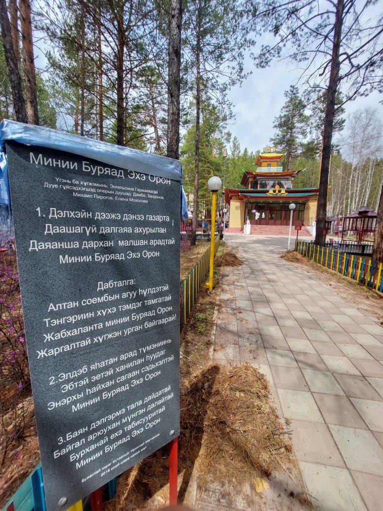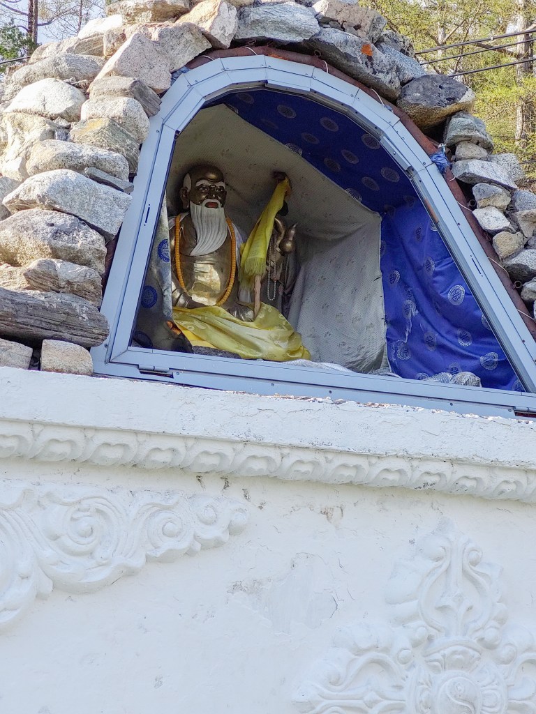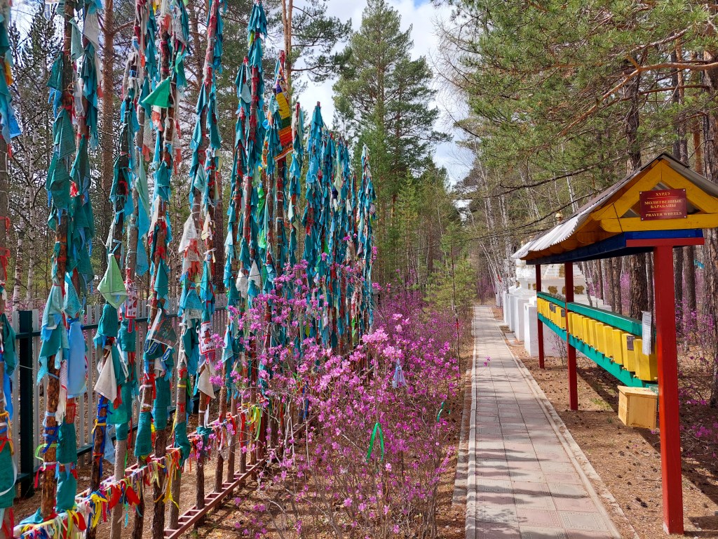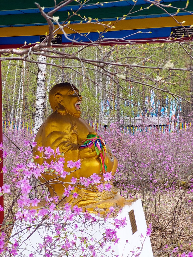 Лазуритовый Будда в беседке и торчащий рядом шаманский столб (сэргэ) в пресловутых ленточках — авось что-нибудь, да сработает.