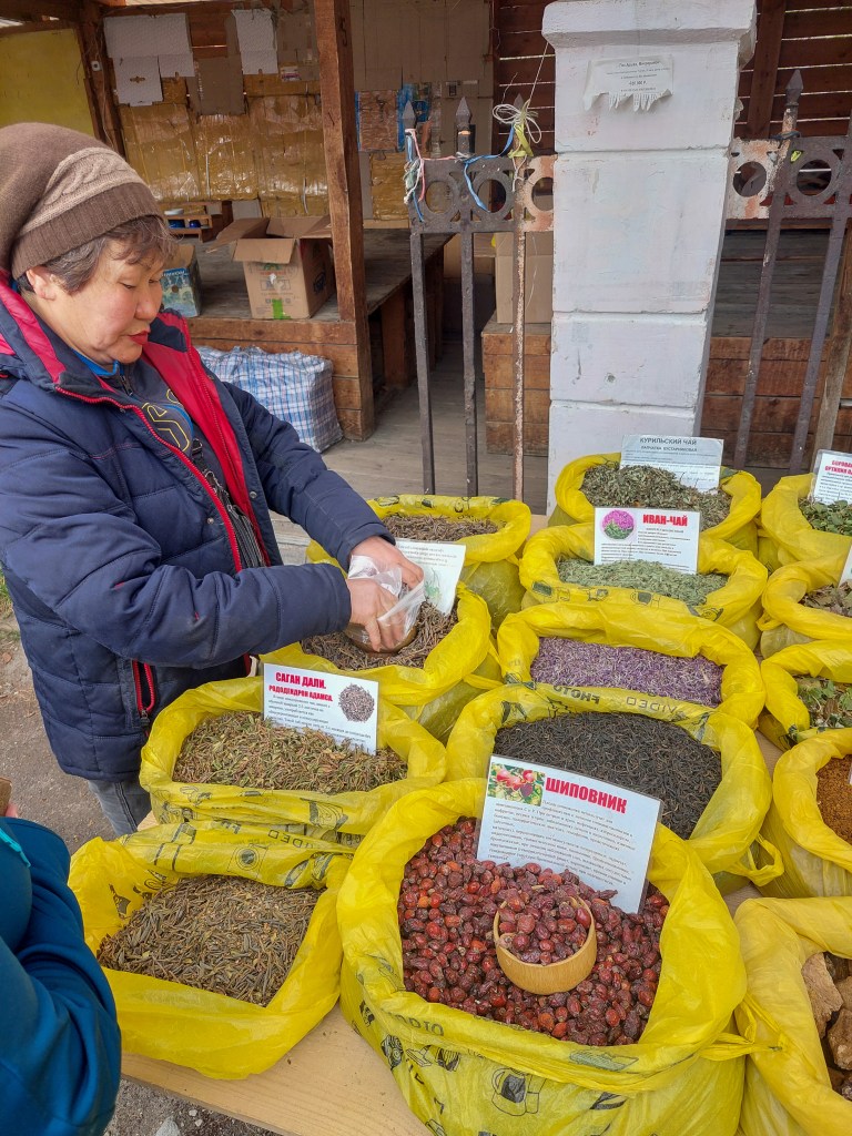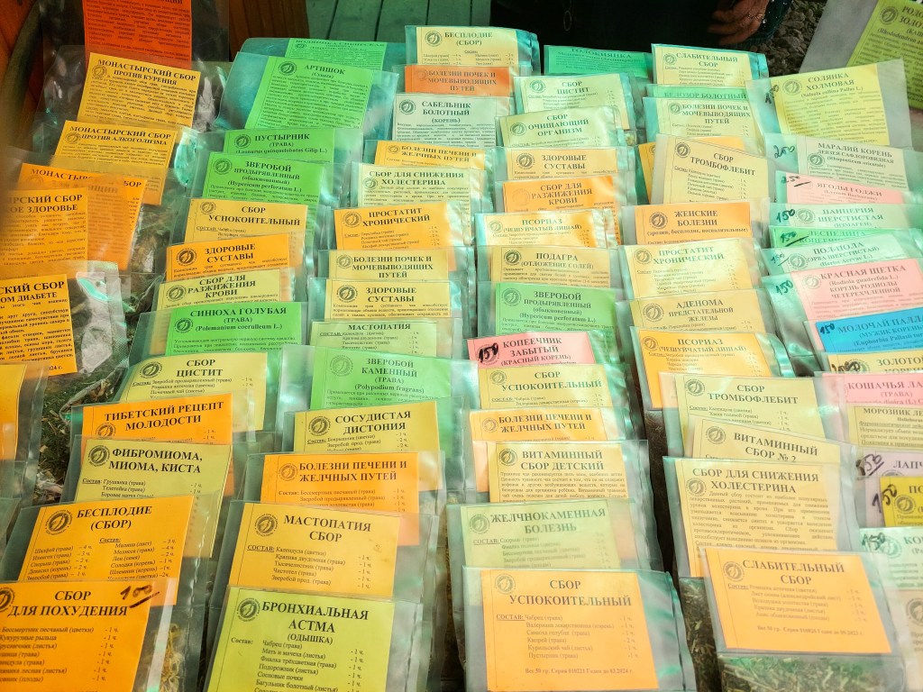 Фитотерапия как самолечение здесь во все поля прёт. Травки от того, от этого, от всего… И вот эту заверните, просто прикольно выглядит. Я достаточно скептично отношусь к траволечению, но могу сказать что это всё-таки не гомеопатия, и какие-то действующие вещества в травках есть. Например, разрекламированная «сагаан дайля» действительно некисло поднимает давление и тонизирует не хуже пары чашек ристретто. Проверили на себе.