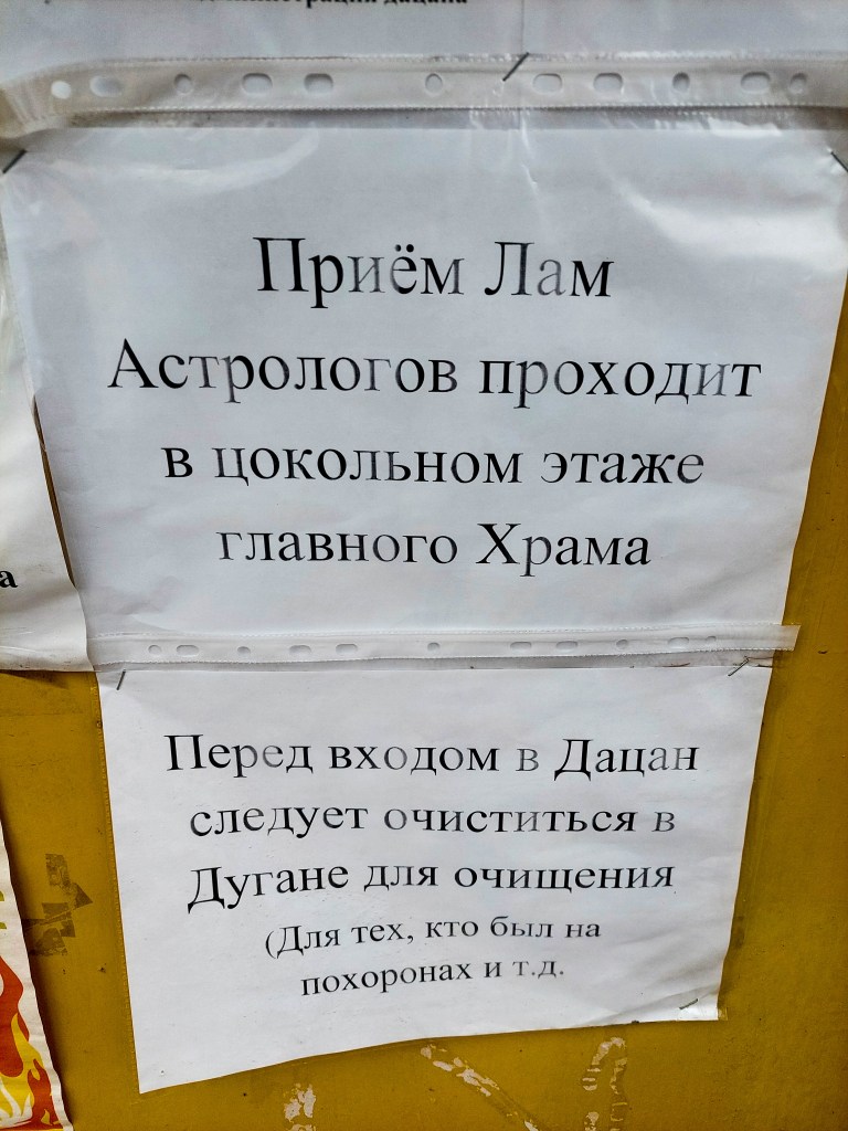 Давайте всё-таки учитывать, что здесь не совсем буддизм, а его некое отклонение, ламаизм, и само по себе сильно пропитанное мистицизмом, а тут ещё и подхватившее обрядность от шаманизма. Объявления тут прям — зачитаешься.