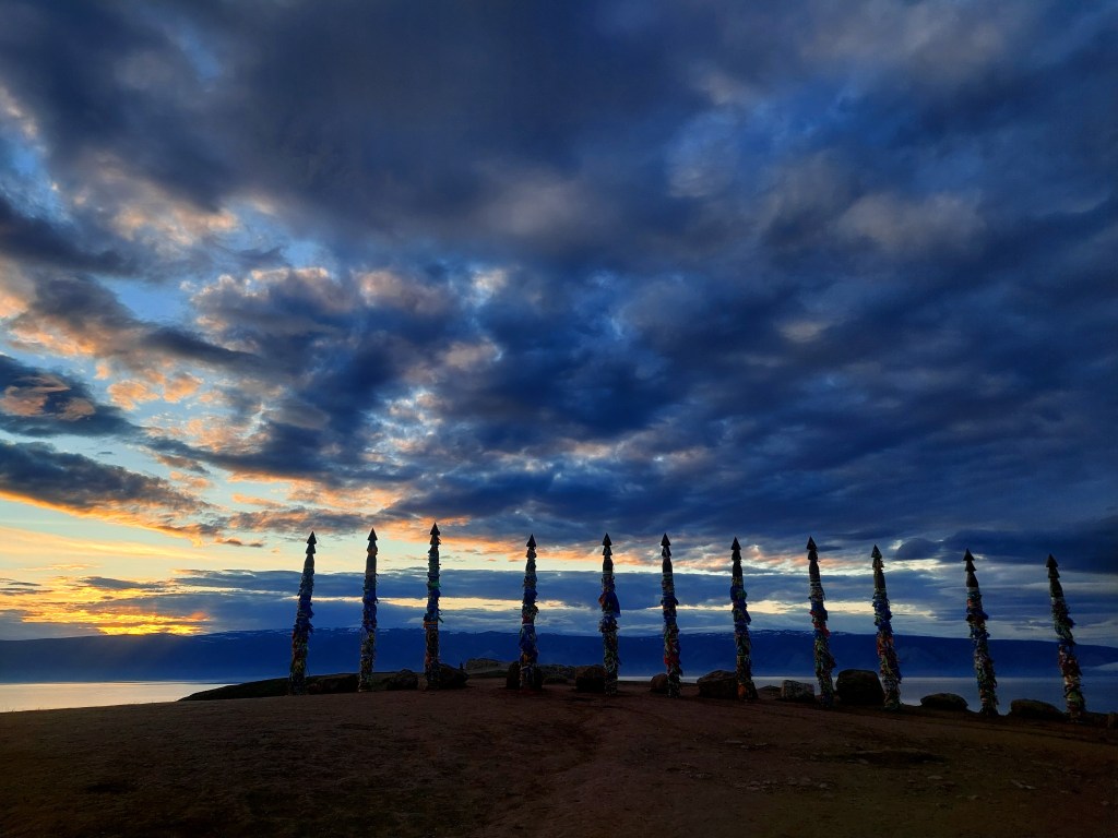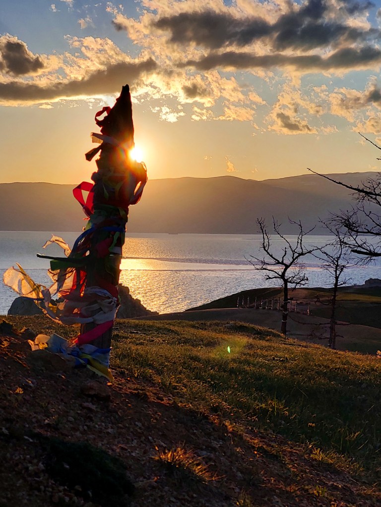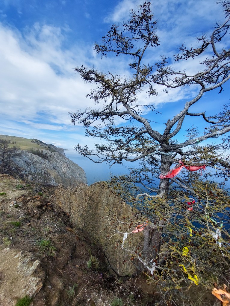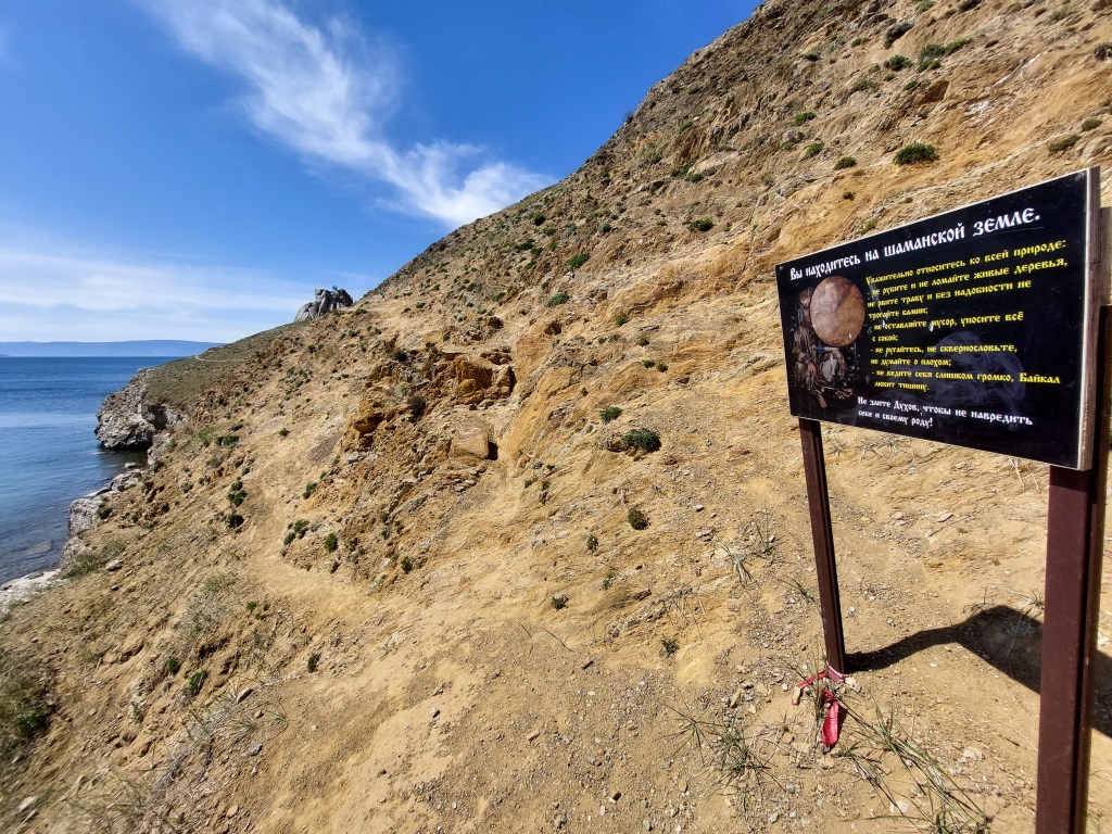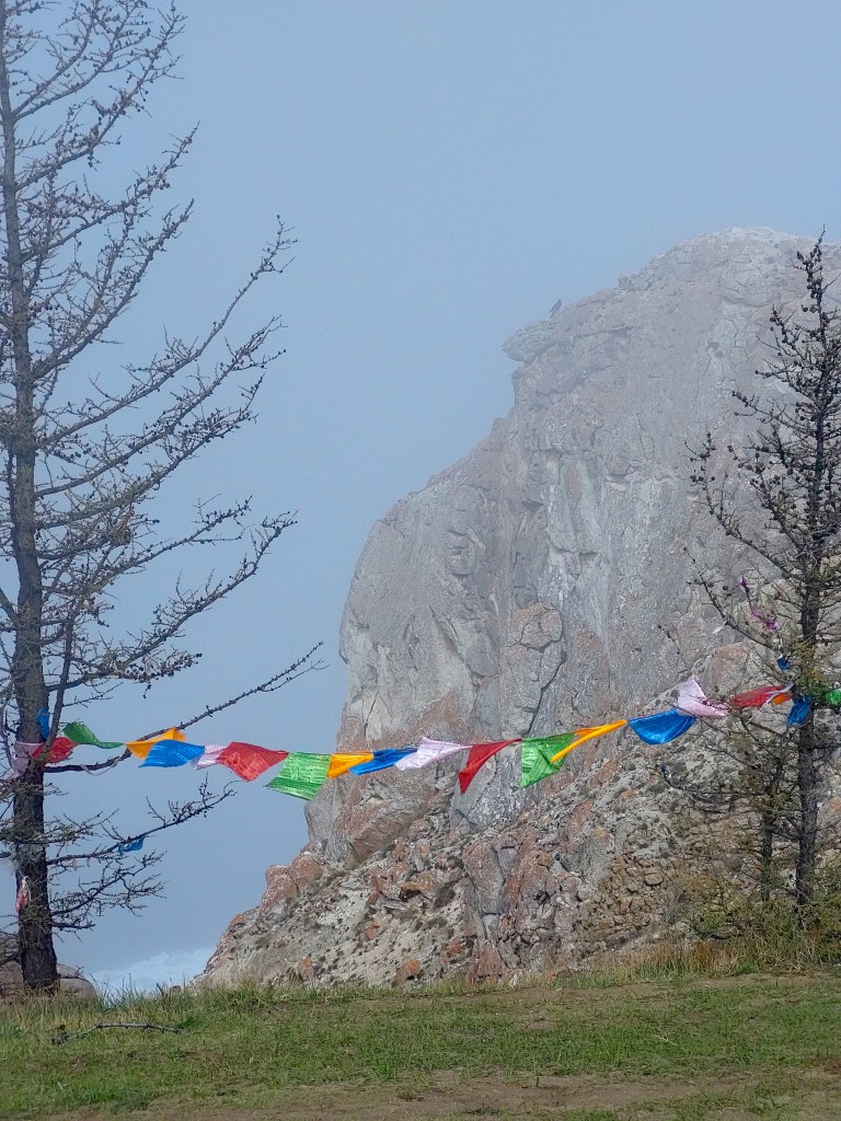 Шаманы утверждают, что это очень известное «место силы», «камень-храм», и прочая и прочая. Вход на мыс Бурхан преграждают сэргэ — ритуальные столбы, все увешанные ленточками-залаа.