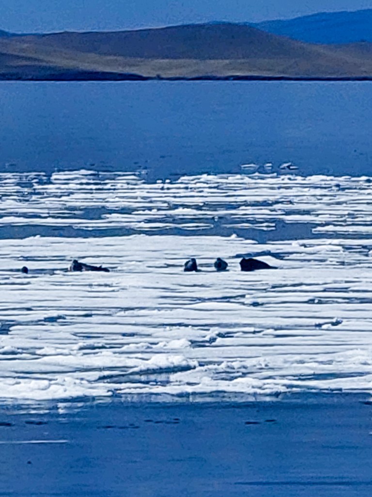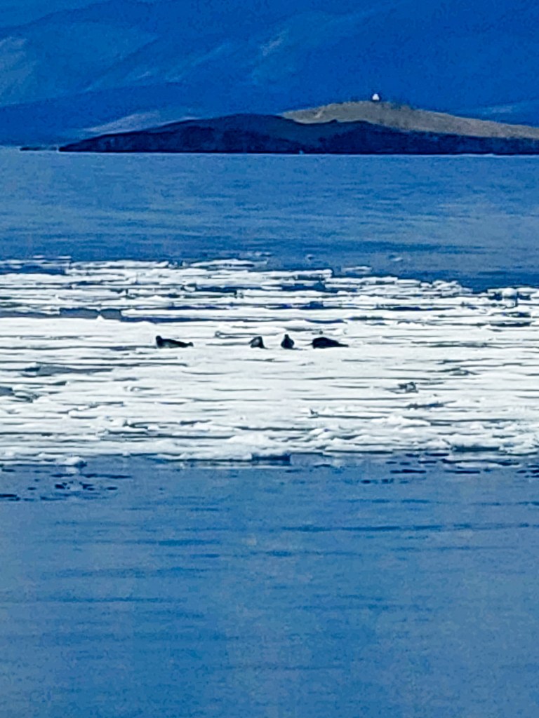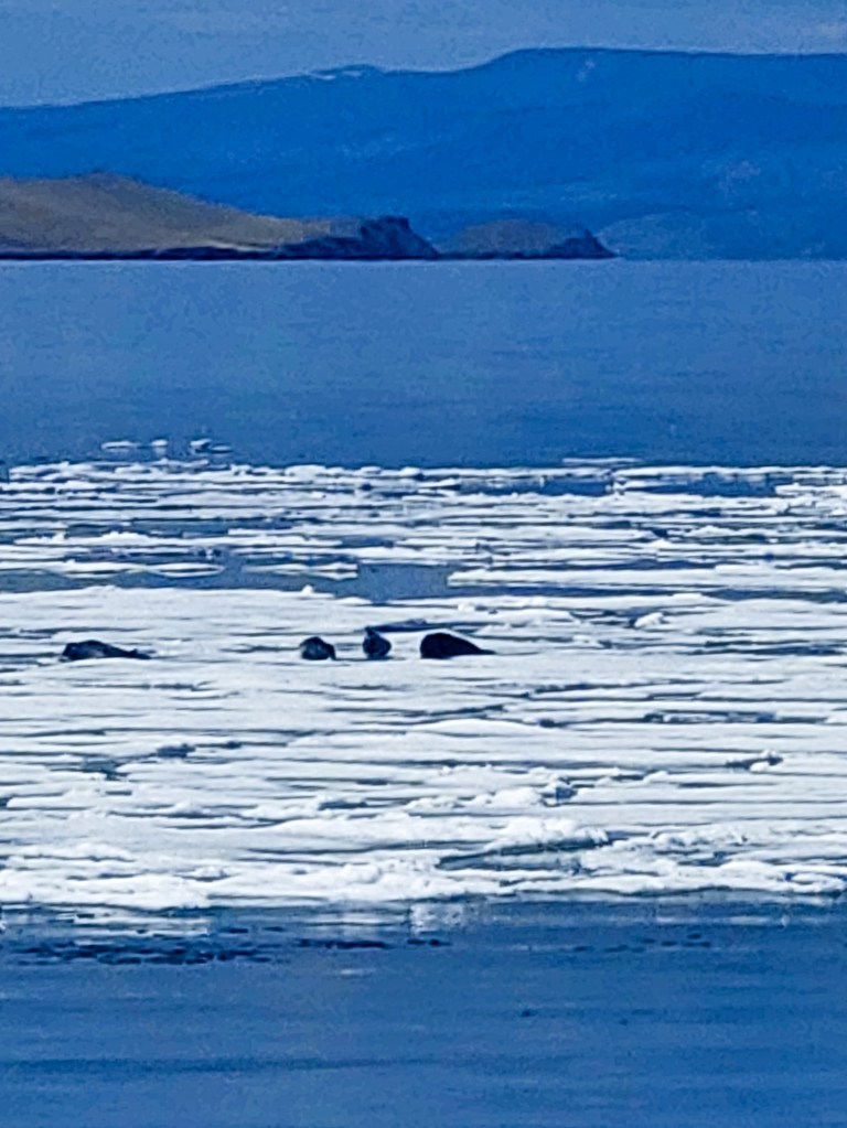 Но капитан лишь хотел показать нам байкальских нерп! Пока лёд не растаял окончательно, эти холодолюбивые местные животинки на нём блаженствуют и доступны для обозрения обычному туристу с борта. А как теплеет — они уходят на север острова, на необитаемые острова, на дикие и недоступные для человека лежбища, и там их нормально увидеть уже не получится. Нам очень повезло! Да, пусть сильно издалека, но мы смогли увидеть диких нерп в естественной среде их обитания. Правда заснять нормально не получилось, уж извините: местные нерпы, несмотря на то что охота на них давным-давно запрещена, очень опасливы и осторожны. И как только видят что корабли движется в их сторону, сразу же соскальзывают в полыньи и отсиживаются там.