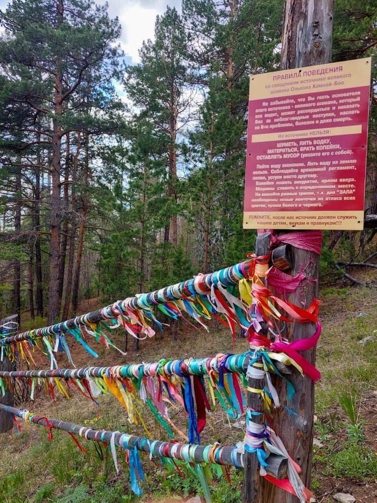 Знакомимся с местными обычаями. Вдоль дороги есть места, около которых буряты всегда делают остановку в пути и делают подношение духу-«эжину», хозяину этого места. Говорят, что если проехать мимо и не задобрить духа сбрызнутой каплей спиртного, брошенной монеткой или повязанной ленточкой-сэмэлгэ, не будет тебе удачи в дальнейшем пути, хозяин обидится и отомстит за неучтивость. Есть даже специальный термин для этого в бурятском языке: бурханить. Спросили у аборигена — а нам-то, туристам, надо духа задабривать? (На туристических форумах всегда рекомендуют следовать этому обычаю) Но местный бурят, пожав плечами, сказал что туристов это не касается совершенно: они по сути-то своей в духов не верят, и поэтому дух над ними никакой силы не имеет. Мы решили подойти с научной методой: в одном месте побурханим, в другом нет — и сравним удачливость двух участков пути после.