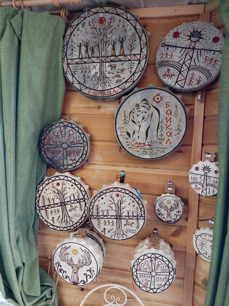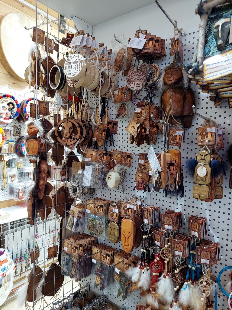 Вернулись обратно в Хужир и внезапно нашли одну работающую сувенирную лавку. Ого, как используется «сакральность» острова коммерсантами! Практически весь мерч — про духов, шаманов, обереги и прочий мистицизм с бубном. Интересно.