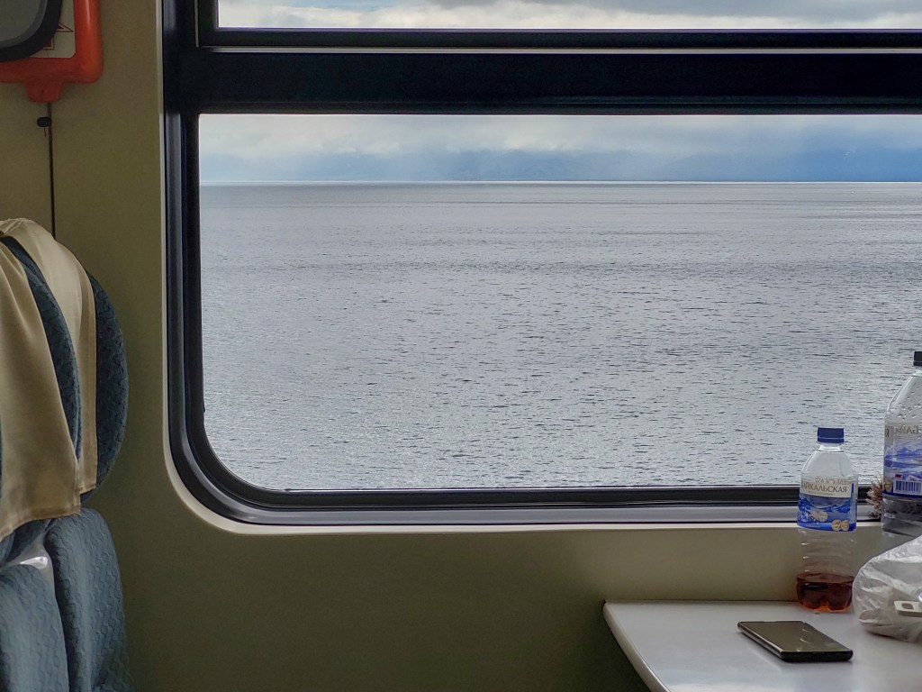 Заоконный пейзаж просто шикарен! Кстати, при покупке билетов на этот поезд вы можете заказать «гарантированные места со стороны Байкала» за отдельную плату. Ни к чему: во-первых, никто не мешает выйти в тамбур и там постоять-полюбоваться-пофоткать, а во-вторых, в другие окна вид не хуже, пусть там не простор, но разглядывать крутую скалу тоже впечатляет.