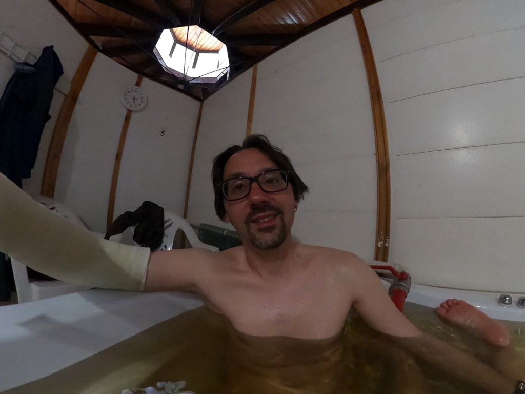 Ну а в финале поездки по Тункинской долине мы попробовали-таки на себе бальнеологические процедуры, заехав в посёлок Вышка, где местные предприниматели облагородили и оцивилизовали горячие минеральные источники. На выбор целебной водичкой вы можете ополоснуться либо в массажных душах, либо в бассейне, либо в ванных-джакузи. Учитывая мою сломаную руку, решили поджакузится. Выглядит всё, конечно, максимально кондово: пластиковыми тонюсенькими перегородками выгорожены отдельные закутки в общем большом помещении, в которых можно раздеться и занырнуть в свою личную ванну голышом. Ополаскивания обычной водой ни после, ни до ванн не предусмотрено. Как и обогрева помещений. Вода в ванну подаётся по большой ржавой трубе, заслонкой управляешь сам. Температура скорее тёплая, чем горячая. Вода действительно минеральная и с достаточно агрессивным составом, на процедуру отводится10-15 минут, не более. Пахнет на удивление несильно, на ощупь — маслянистая, и кожа после ванны приятно-шёлковая. А уж как расслабляет! Залезаешь в воду в скептическом настроении — что я, в ванной не плавал что ли? А уже через три минуты ощущаешь себя растекающимся желе… Обожаем горячие минеральные воды!