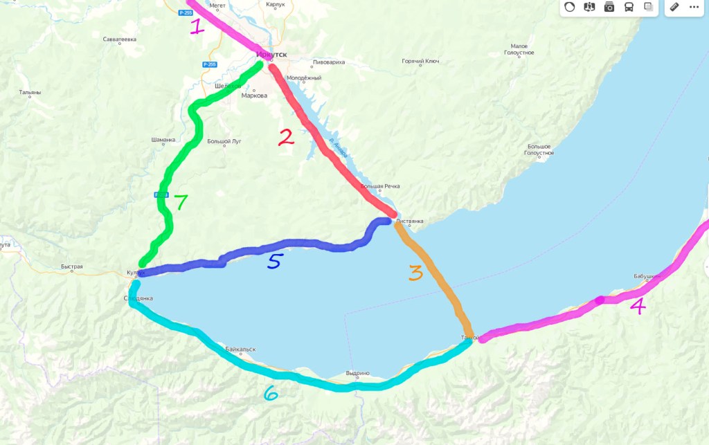 Думаете, кругобайкальская — значит, мы прям вокруг озера колечко сделаем и обратно в Иркутск вернёмся? Ха! Нет, тут название обманываем. Даже полкруга не проедем. Но для того, чтобы объяснить всю уникальность и интересность маршрута, который мы посещаем, нужно сделать небольшой отступ в историю и выложить карту с пояснениями, что где и зачем.