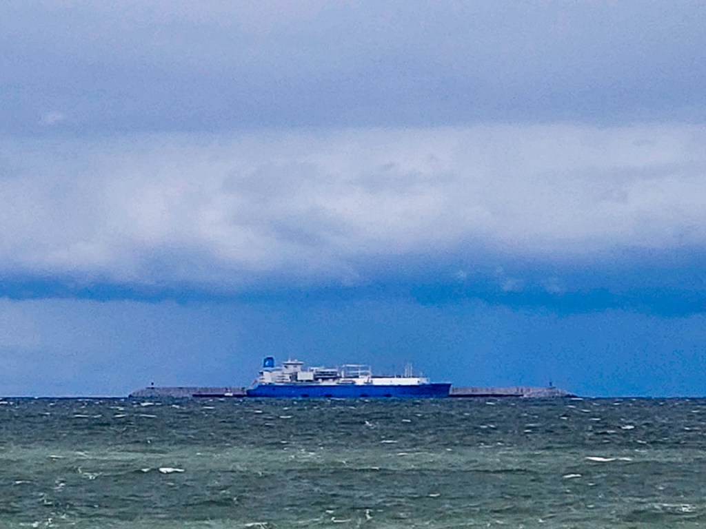 Кстати, если сильно призумить горизонт, можно увидеть необычное. Там маячит недавно введённая в эксплуатацию станция приёма сжиженного газа. И судно, которое туда этот сжиженный газ привозит. Оттуда по дну идёт труба на берег, в подземное хранилище газа у деревни Романово, а оттуда уже и в систему газоснабжения Калининграда и области. Почему необычное? Да потому, что проектировать и строить это непростое дорогостоящее инженерное сооружение, способное выдерживать зимние балтийские шторма, начали ещё тогда, когда в нём не было никакого смысла: Калининградскую область с запасом снабжал мощный газопровод «Минск-Вильнюс-Каунас-Калининград», и когда ещё с ними обострениями отношений и не пахло. То ли это был такой гениальный провидческий план, то ли долгосрочный расчёт на рост населения — сейчас уже сложно сказать. Но сторонники всяких теорий заговоров раннее строительство этой станции СПГ обсасывают со всех сторон.