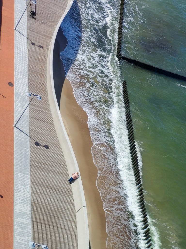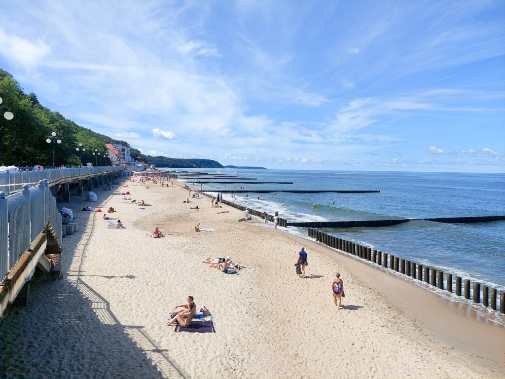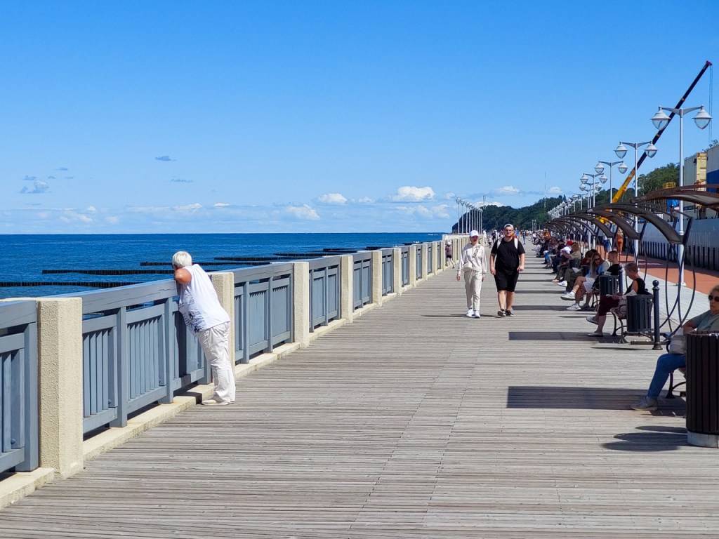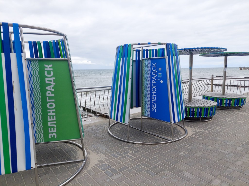 С молла было хорошо видно, что примыкающая к морю часть Зеленоградска сильно изменилась с нашего последнего посещения. Появилась куча новых зданий, снесли уродский недострой, торчавший прямо в море над курортниками, да и весь променад переделали, похоже, от самого основания до верха. Мы помнили перекошенные бетонные плиты и испещрённый дырами асфальт Зеленоградска пятнадцатилетней давности, сейчас же — плиточка, парапеты, скамеечки, качельки, забавные переодевалки. Выглядит очень цивилизовано и вполне уже похоже на другие курорты балтийского побережья, польские и и немецкие. Издалека.