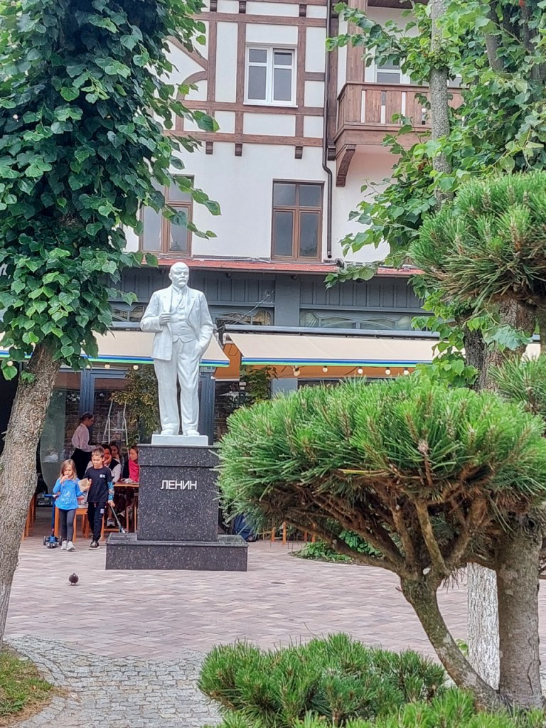 Ленин, крашеный серебрянкой, на фоне фахверкхауза смотрится конечно немного диковато.