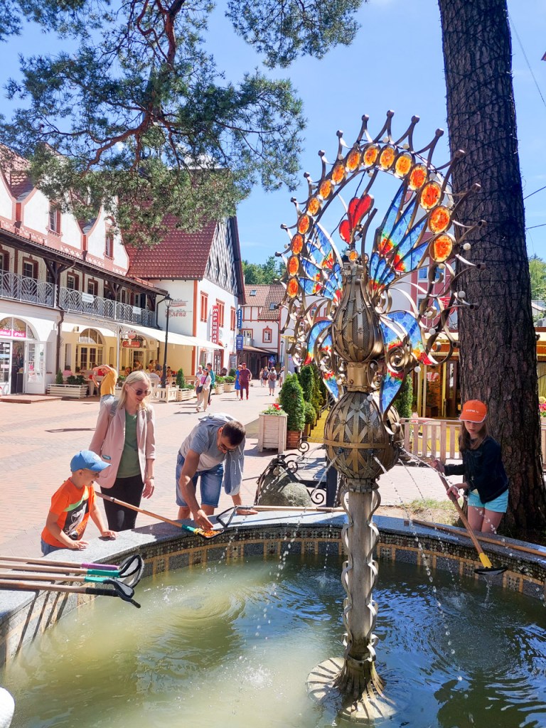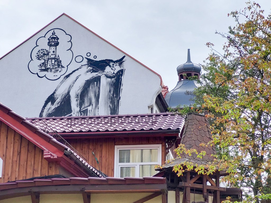 Один из символов старого Зеленоградска, который нам хорошо запомнился, водонапорная башня. Когда мы видели её в последний раз, она была в аварийном состоянии, поговаривали даже что она накренилась. Теперь её отремонтировали (правда местные ворчат что сделали это абсолютно топорно, уничтожив историческую лепнину), обстроили со всех сторон всякими зданиями модных отелей, на её вершине открылась смотровая площадка (правда вид с неё намного хуже, чем с нашего колеса — она вполовину ниже и далеко от моря), а в самом здании башни открыт музей частной коллекции изображений и фигурок котиков «Мурариум» — вполне в духе современного Зеленоградска. Но так получилось, что в эту поездку до посещения башни у нас руки не дошли… Ладно, оставим на будущее.
