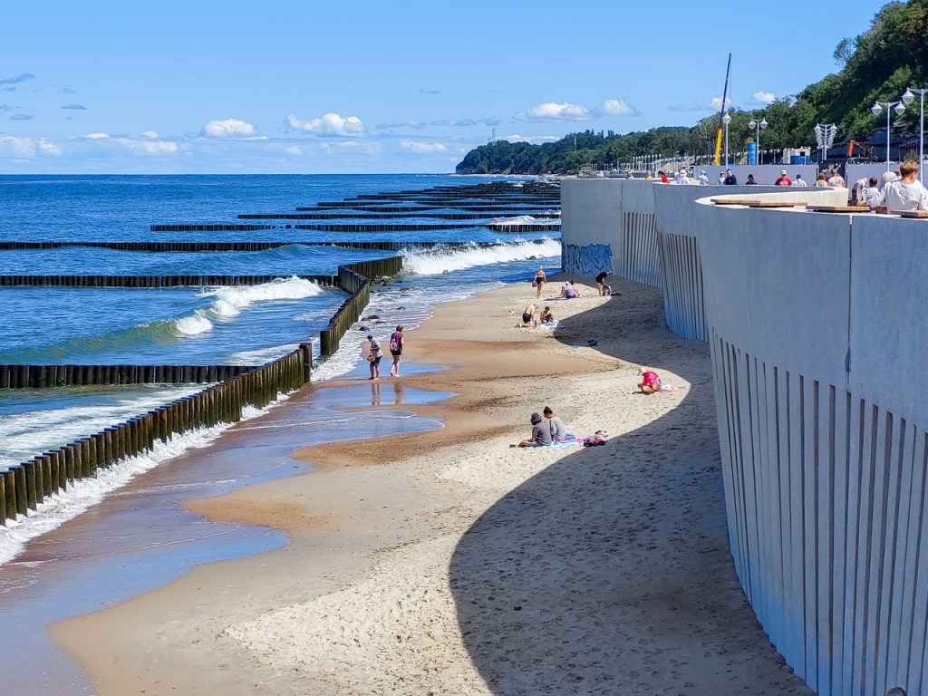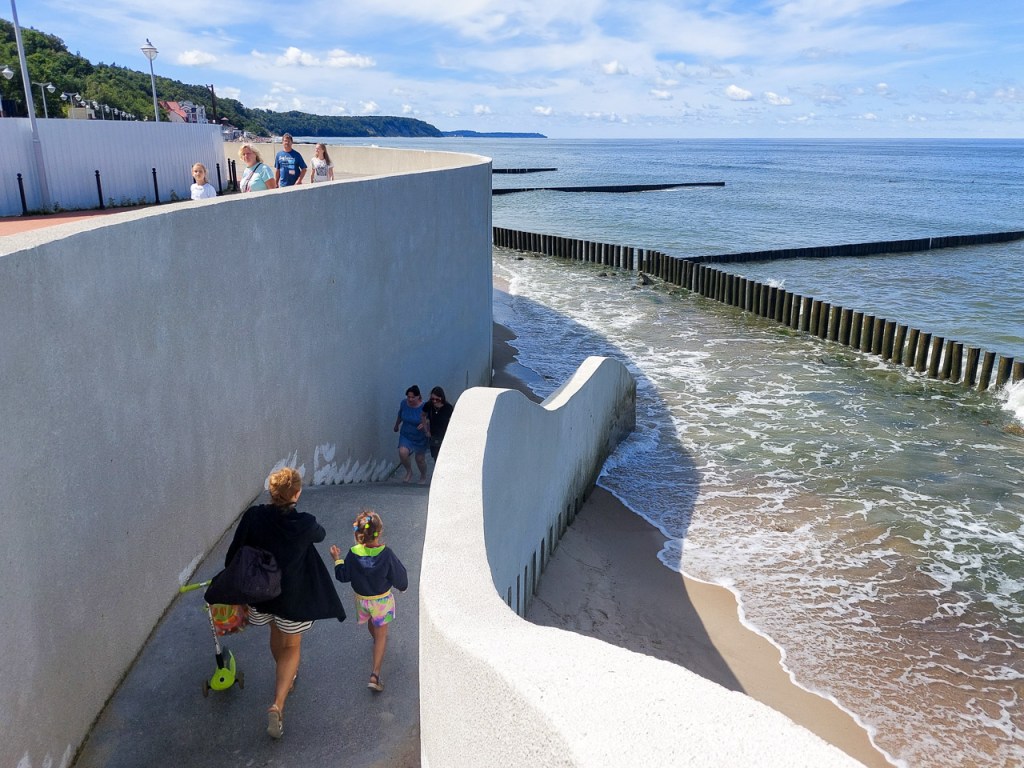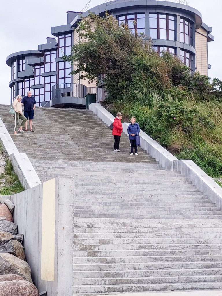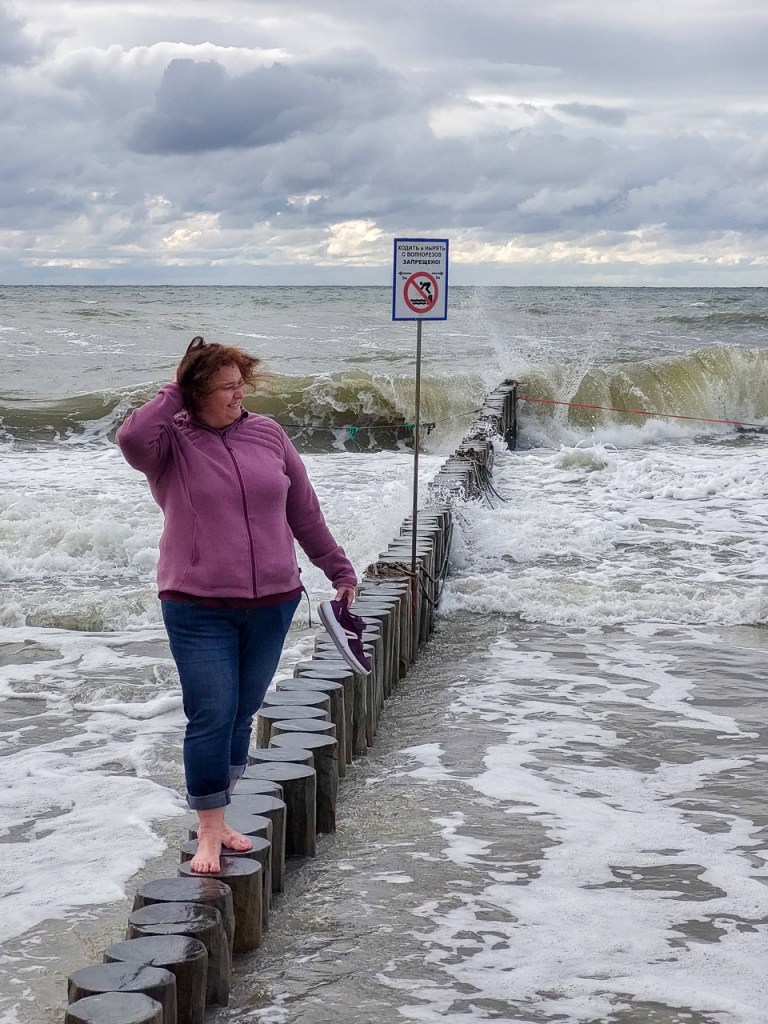 Естественно, первое куда мы бежим в приморском курортном городе — это море! Мы же сюда ехали с ледяного Баренцева, айда сравнивать с Балтикой. Ой. Похоже с купанием будет не очень. Штормит, пляжа перед променадом, о котором нам с упоением рассказывали знакомые, практические нет — высокие волны перехлёстывают его весь и бьют в фундамент.
