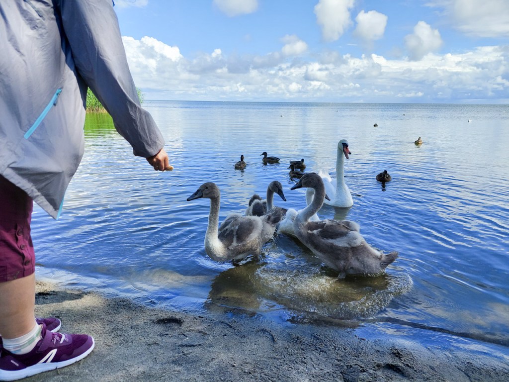 Катясь по косе, ты так и мотаешься из стороны в сторону, с моря — на залив — на море — на залив, кормить гадких лебедей.