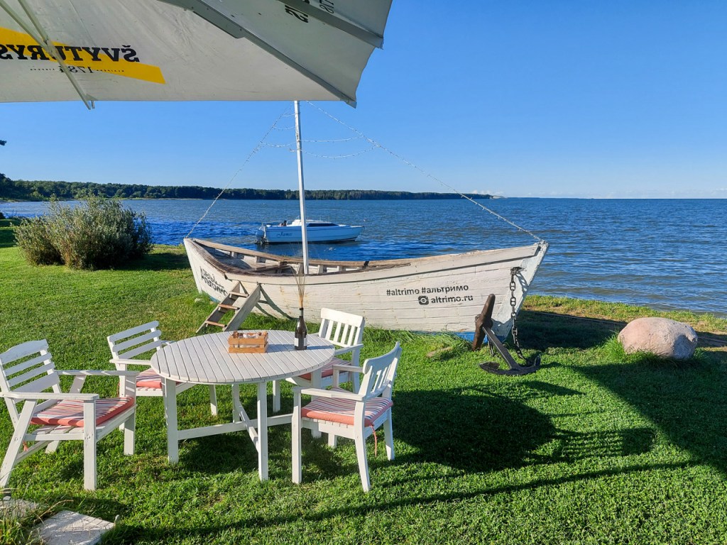 Дальше, до дюны Эфа и крайнего на нашей части косы Морского, мы решили уже не ехать. Чем дальше вглубь косы дорога, тем хуже асфальт. Наши попы уже недвусмысленно намекали, что пора бы экзекуцию прекратить. Потому мы зарулили в Рыбачий на тему перекусить с красивым видом на залив…