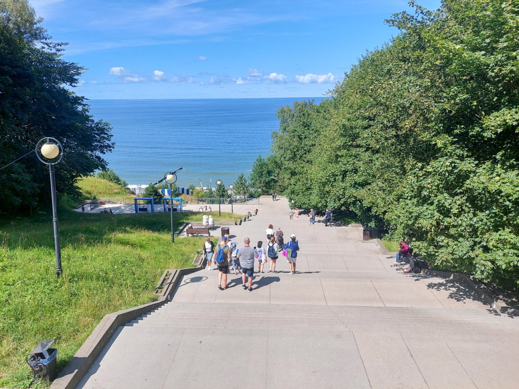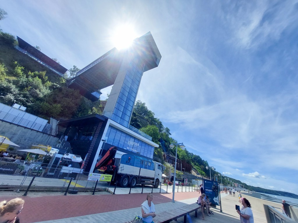 А вот и новый лифт в город! Однако далеко же его отнесли от изначальной точки. Но в любом случае — хорошо что он появился. В отличие от плоского Зеленоградска, Светлогорск стоит на весьма крутом обрыве, и средство спасающее ноги отдыхающих от ежедневных спусков-подъёмов на пляж, было городу необходимо.