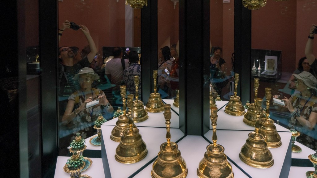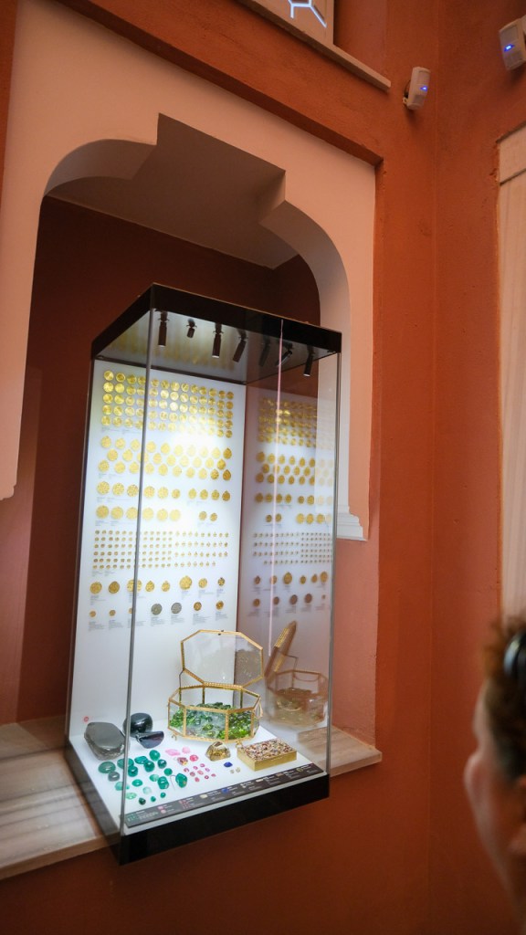 Рыбов. Кросивое. Показываем.БрУльянты. Это ж надо было умудрится сделать такую подсветку, под которой алмазы не блестят.Не, есть и интересные моменты. Например зеркальные витрины а-ля калейдоскоп здорово расширяют пространство узких залов.А если присмотреться, и в местах, открытых для прохода туристов, есть интересные элементы, доступные для общупывания.Но вот что стоило бы посадить в этот интерьер пару музыкантов в исторической одежде и играющих аутентичные мотивы? Как бы это оживило.А вот за этим видом со смотровой мы сюда и шли.Место слияния залива Золотой Рог и Босфора, слева полуостров Бейоглу, справа — азиатская часть Стамбула.