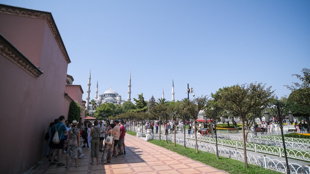 А напротив Голубой мечети — Айя-София. Сходить что ли завтра?Котик рядом с Айя-София будто говорит: «Да вы что, дураки?»Во-первых, Айя-София вся в ремонтах сейчас. А во вторых, очередь на вход чудовищно огромна, пару часов на самом солнцепёке.Поэтому мы решили провести жаркое дневное время в дворце Топкапы, там зелени и тени побольше. И залы музейные прохладные.Кто ж знал, что прогулки по прохладным галереям дворца сейчас стали почему-то безумно дорогими?