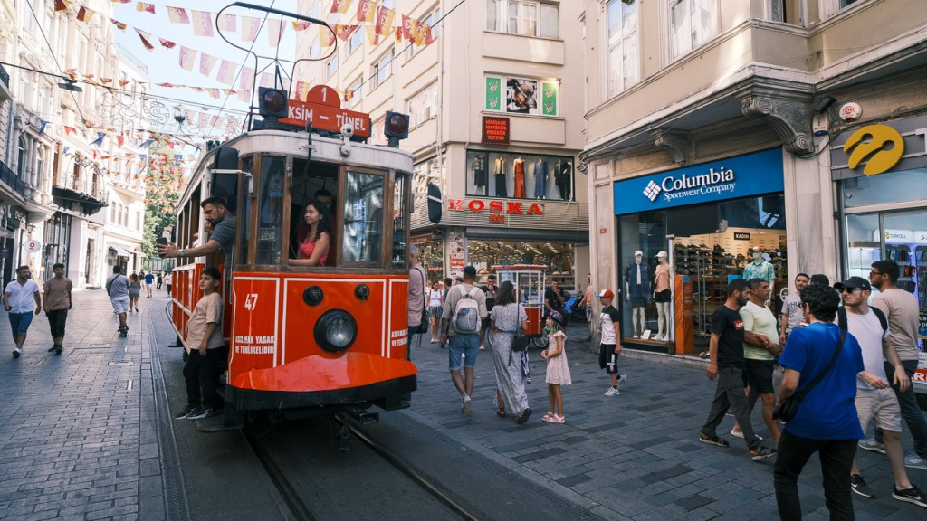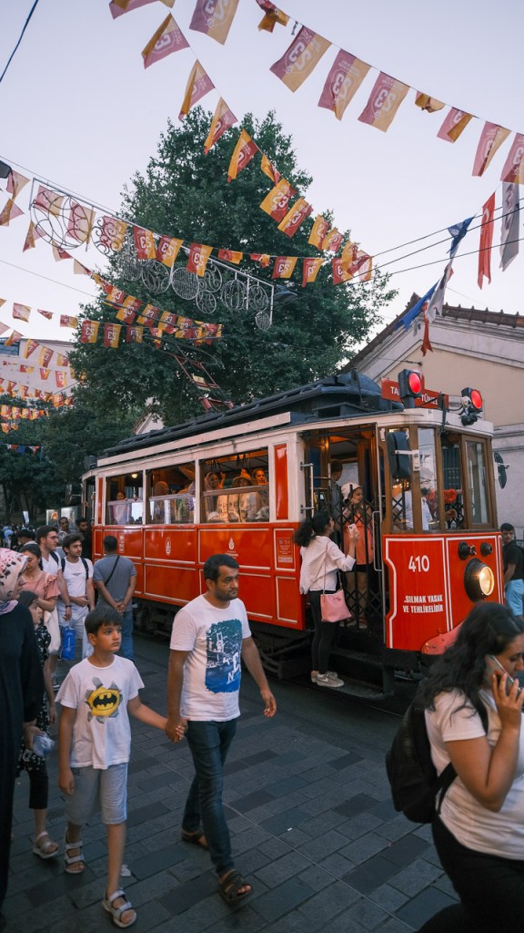 Вот вам стамбульского котика с подведёнными стрелками на глазах. А мы решили больше в дорогостоящие туристические аттракиционы не ввязываться.И ещё один грязноносый котик. А мы вместо платных развлечений решили пользоваться бесплатными. И поехали гулять по улице Истикляль.Это эдакий местный Арбат, но что называется, «на максималках». Длиннее, насыщеннее, круче.По пешеходной улице ходит старинный трамвайчик. Очаровательный донельзя! Вот всегда меня удивляет: что за притягательность есть в старых трамвайчиках? Везде, где они ходят (Лиссабон, Прага, Милан и пр) они становятся центром притяжения, визитной туристической карточкой района. Хотя казалось бы — просто устаревший неудобный нефукнциональный транспорт.