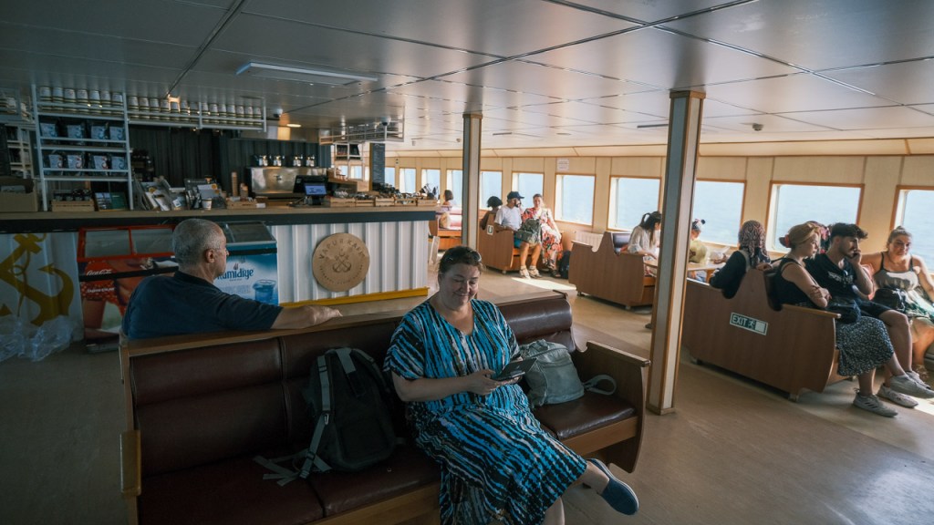 Мы сели на один из них и поплыли вдаль. Недалеко от Стамбула есть группа островков, именуемые Принцевыми, на которые местные выбираются поплавать-позагорать. Туда и направились.Могу сказать, что даже просто полуторачасовое плавание по морюшку в жаркую погоду действует целительно и расслабляюще.Кондиционером паром не оборудован, но можно выбрать зал, продуваемый ветерком.Паром проходит поочерёдно несколько остовов. Нам было абсолютно пофиг на каком выходить: планов и идей не было. Просто попасть на пляж.Так же абсолютно наобум выбрали пляж, здесь до них от от основного причала острова подбрасывают шаттлом-катерком и оценить заранее, где ты будешь валяться на шезлонге нет возможности. Да, все пляжи на островах — платные и благоустроенные.И неожиданно случайным образом выбранный пляж оказался местом идеального отдыха именно для нас. Ибо мы не любим загорать на песке, под полупрозрачными зонтиками, предпочитая более глубокую тень. Тут её давал изумительный сосновый лесок, на террасах которого мы и зависли на целый день.Да, был и стандартный песчаный пляж с шезлонгами. И кучей народа там. А мы наслаждались спокойствием в прохладном отдалении от основной толпы.