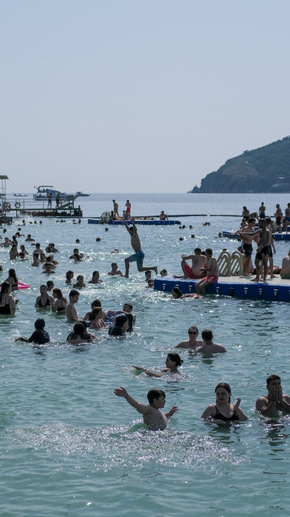 Народу, конечно, овердофига. Но к счастью, 90% из местных почему-то не умеют плавать. И потому с уходом дна под ногами исчезает и толпа. Плавай — не хочу!