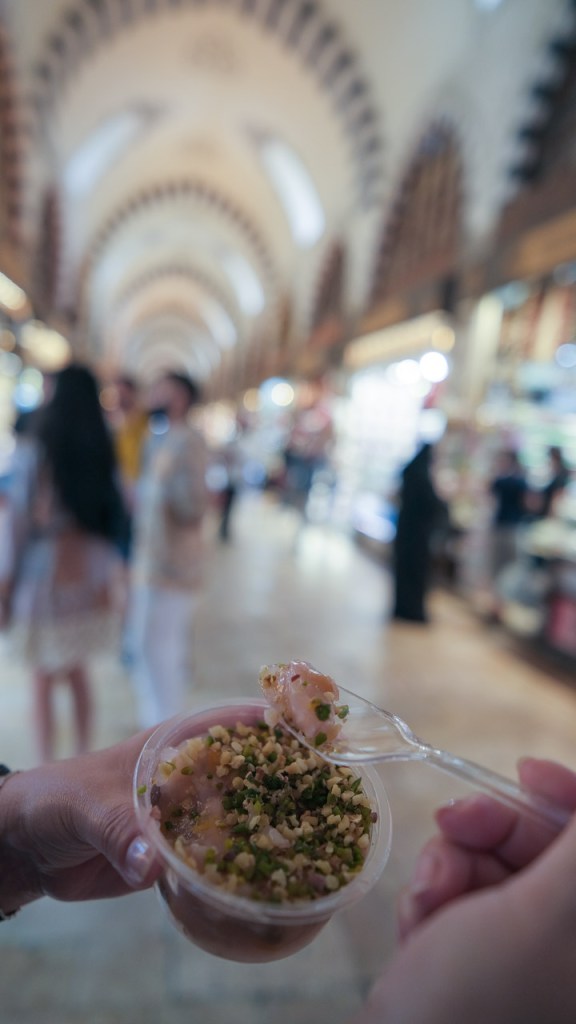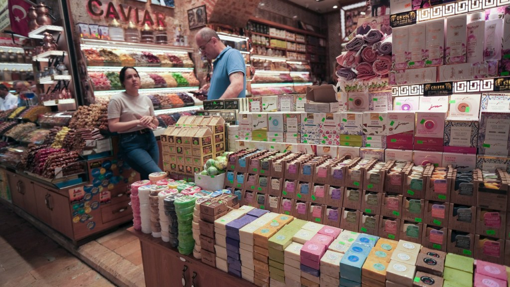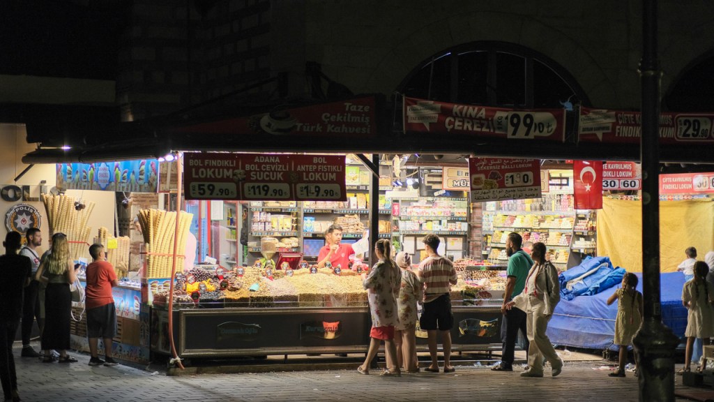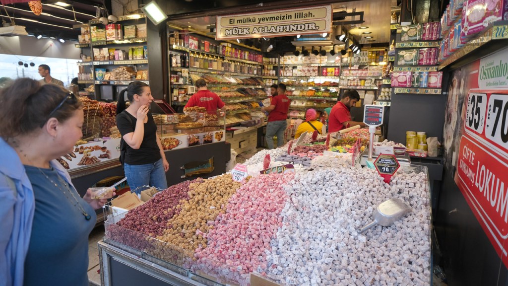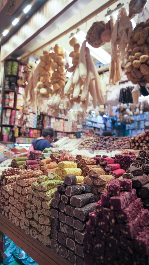 А это ещё одно, совершенно неожиданное место для любования заливом: метромост станции Халич.Она расположена на мосту, как и наша «Воробьёвы горы». По бокам идут пешеходные эстакады.И вид с них очень хорош, особенно вечерний. Как на мечеть Сулеймание с башней Беязыт (видите голубую подсветку? Снова врали. На следующий день было жарче)Так и на район Бейоглу, с Галатской башней.Так, куда ещё хочется сходить? Во, можно заглянуть на Египетский рынок, именуемый в народе рынком специй.Здесь действительно торгуют сильнопахнущим, но не только специями, но и мылом, например.Или сухофруктами разнообразными. Гм. Чурчхелу я считал сугубо кавказским эндемиком. А гляди ж ты.Неожиданно наткнулись на раздачу какого-то авторского десерта для местных.