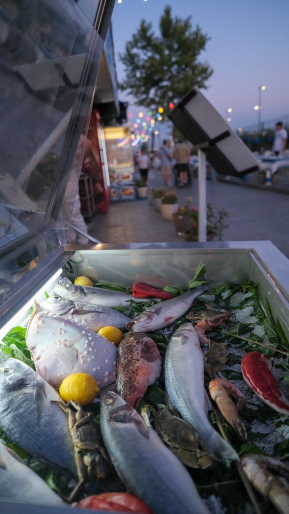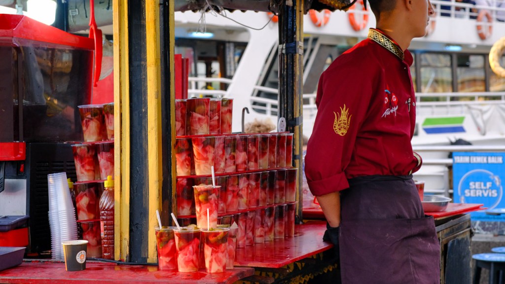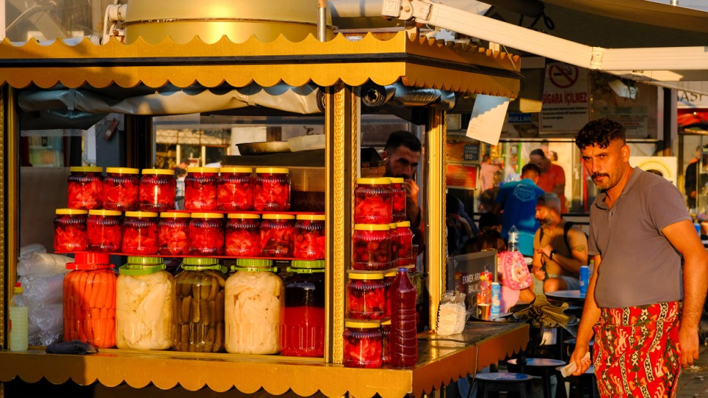 Ну и сюда ещё зашли. Потому что как не уверяли наши производители, что в продаже у них «постельное бельё такое же как они поставляли в Икею» — врут. Ткань другая, выносит несколько стирок и рвётся. Оригинал же есть оригинал.Ну а затем — снова в гущу туристических радостей. Набережная у пристани Эминемю — самая свежая еда в городе.Как вы думаете, что в бутылке? Сок какой-нибудь? А вот и не угадали. «Похмельный элексир» — рассольчик от квашеной капусты. Турки знают, что порой надо измученным туристам.Шутка. Просто квашения, соления и маринады — часть турецкой кухни.И на Эминемю она даже часть уличного фастфуда. Правда, только там: больше нигде не встречал стаканчиков с капусткой «на перекус».Основные блюда — рыбные. Что поймано в заливе -тут же идёт на гриль.