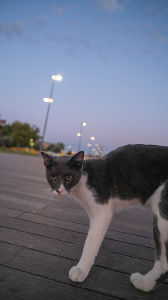 Судя по количеству шерсти на тканевой крыше, это у котика излюбленное место.Здешние котики совершенно не зашуганные, очень деловые и самостоятельные. Людей не пугаются.И подкармливают их везде где только можно: в каждой лавке, в каждой кафешке, в каждом подъезде будет насыпано кормом и стоять мисочка с водой. Собаки в этом городе находятся в ущемлённом положении.А это — недавно открытый порт для морских лайнеров и по совместительству модный райончик бизнес-стиля. Дорого. Понтово. Неинтересно.Но котики всё равно в наличии.