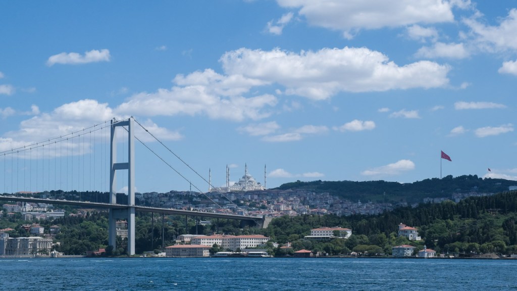 После рынка мы почуяли, что погодка вновь стала припекать, и решили отдохнуть на воде. Уж больно нам понравилось по Босфору плавать. Поблизости оказался обычный круизный теплоходик за 130 лир. Вот примерно такая штуковина.Слушайте, столько удовольствия за полтора часа прогулки! Шикарная развлекаловка в жаркое время. Продувается насквозь, жары как не бывало.Сидишь себе в прохладе, тебя немного покачивает, и перед глазами картинка постоянно меняется. Вот весёлая застройка около Кадыкёй.Модный район Галатапорта. Сейчас у причала нет лайнеров.Дворец Долманбахче. Надо всё-таки было там погулять, там внутри классный парк.Девичья башня на крошечном островке. Лучший вид на неё с азиатской части города, от причала Харем. Говорят, там виды на закат тоже очень хороши. Увы, не хватило времени и сил оценить.Моряки недолюбливают Босфор за толчею, суету и узость. И это понятно: до этого ты шел по морю и расходился с бортами, едва видными на горизонте, а сейчас с твоим бортом другие суда расходятся в считанных метрах. Ужас!Танкер величаво и не торопясь идёт под мост первого автомобильного кольца (некий аналог нашего ТТК)Очень изящный вантовый мост, Великая мечеть Чамлыджа — говорят, что самая большая в мире на текущий момент, и феерических размеров флаг страны, площадью в тысячу квадратных метров.