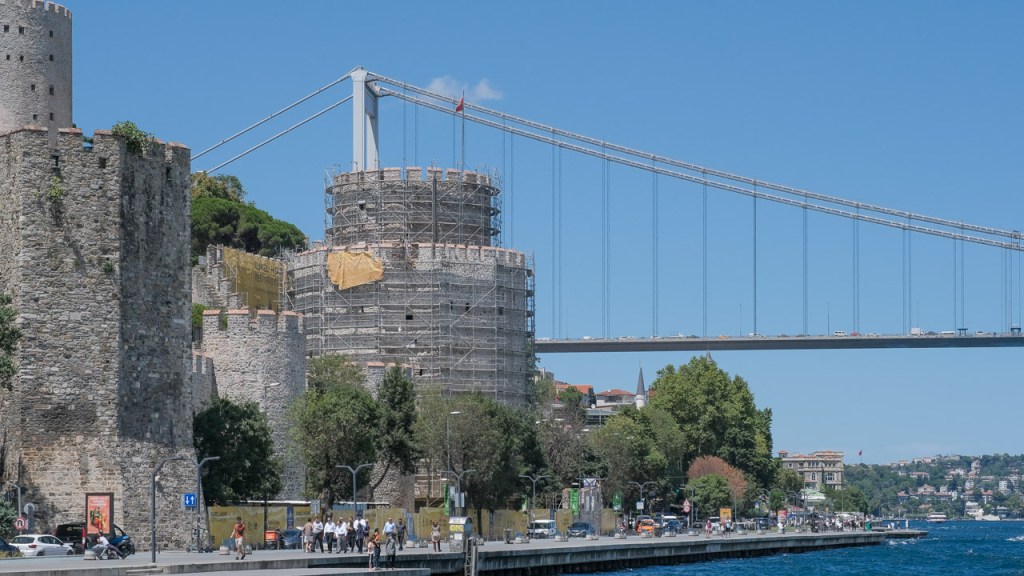 Какая прелесть! Плавучий бассейн с пляжем. У нас нечто такое организовали в Нагатинской пойме. И так же, как и тут, спросом оно особо не пользуется. Хотя казалось бы по жаре, прямо в центре города…Но видимо, стамбульцы предпочитают загорать на моторных яхтах.Ну почему, почему они пьют обжигающий чай по жаре?Мост второго автокольца (аналог МКАД) и крепость Румели. Жалко, что до неё не добрались — говорят виды на Босфор с неё хороши.Чайки высшего пилотажа — они умудряются на полном ходу вырывать куски бутербродов у зазевавшихся пассажиров на борту.А на другом берегу обычные частные домики, выходящие своим двором прямо на Босфор.Наверное, охренительно сидеть в зелени своего сада и любоваться огромными тушами контейнеровозов, проплывающих в считанных десятках метров от тебя.Или плавать в своём бассейне с видом на танкеры.Но как-то особо народу в зданиях видно не было, несмотря на их элитный вид. Жара?Хотя какой уж элитный вид, если даже такие халабуды попадаются.Но то, что есть горожане, имеющие в собственности кусочек своей набережной Босфора, меня здорово впечатлило.Потому что дальше пошли районы с обычной компоновкой: набережная общая, дома через дорогу.Каким же удивительно тонким кажется мост…Вернулись в свой район и решили наконец сходить внутрь молельного зала Голубой мечети: до этого обходились просто прогулками по внутреннему каменному двору, потому что для визитов туристов зал открыт только в определённые часы и мы всё никак не попадали. На входе обязательно нужно разуться. Под ногами чистейший очень приятный ковёр.