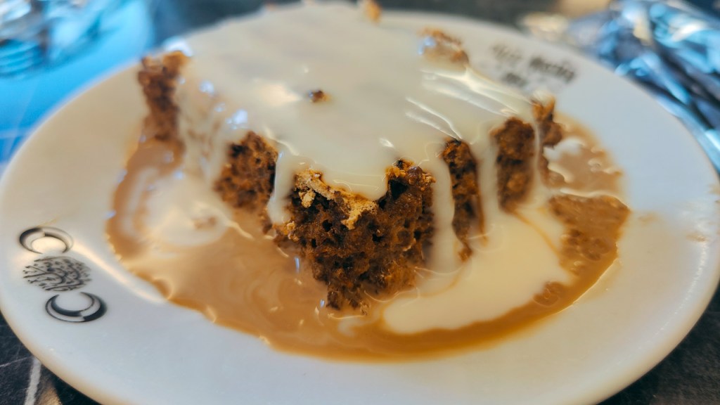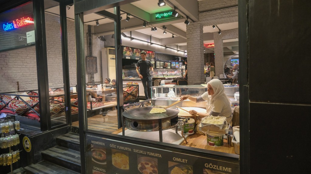 Ну и немножко греха чревоугодия напоследок. На площади Таксим самые быстрые шаурмячные в городе!Шаверму делают сухую, без всяких майонезов и кетчупов, только мясо и овощи, причём без всякой там капусты и моркови. А я взял ещё один местный эндемик: «мокрый бургер». Реально булка пропитана томатным соусом, в котором томилось мясо. Вкусно, но весь обляпываешься.Ну и конечно, немного десертов. Этот казался мне по виду просто взбитым запечённым яйцом а-ля омлет, а оказался крупнопористым тестом с кофейной пропиткой.А вот это — тонкий жареный хворост, напоминающий вермишель, запечённый и политый патокой. А внизу — расплавленный пресный сыр! Да, турецкие десерты стоят того, чтобы их пробовали.На этом вкусном финале мы завершили своё жаркое путешествие и улетели в Москву, которую в это время затапливало дождями.