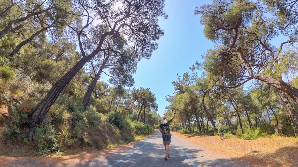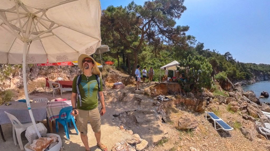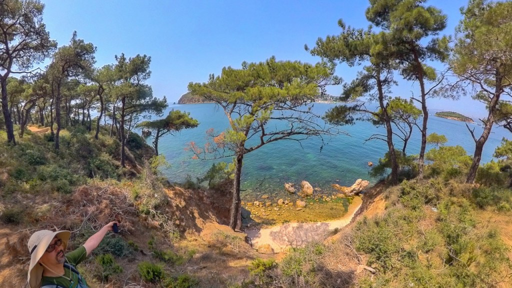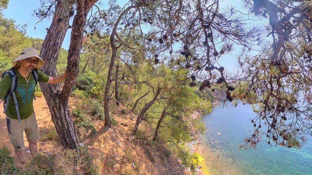 Шагать по асфальту через некоторое время стало некомфортно. Свалил на грунты, хоть и не понял, что за надписи на турецком были на съезде.Дорожки по лесу красивые идут, конечно, ничего не скажешь. О, пляжик какой внизу, дикий вроде. Спуститься, искупаться, охладиться?Спустился. Но увы, даже вот такого вида «пляжи на камнях» тут платные. Не, я уж лучше до пляжа с женой дойду кругом по острову, там и искупаюсь и охлажусь.Ага. Подъём в +40 по солнцепёку. Всё как я люблю.