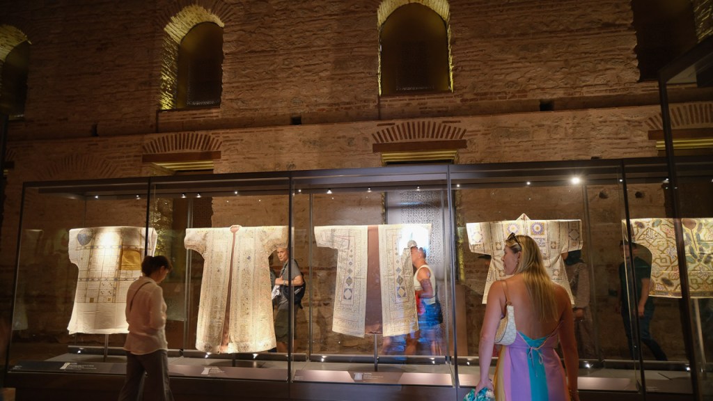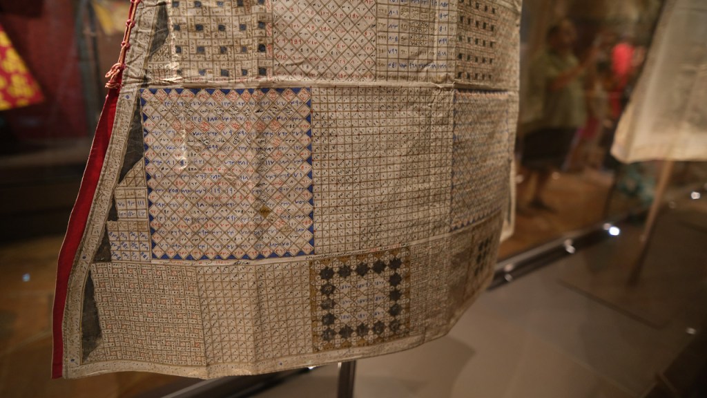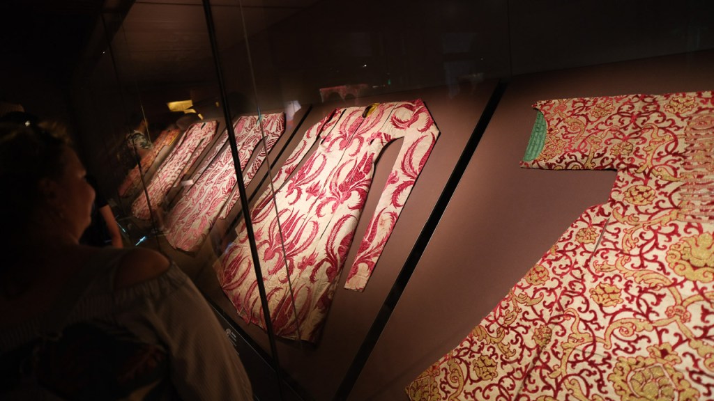 Музейная часть экспозиции по-классически подаётся очень скучно для туриста. Прям как в региональных краеведческих музеях. Простой пример: вот, любуйтесь рисунком на халате. Для этого халат плоско разложен в витрине, как на операционном столе. Как он выглядел на человеческом теле, как необычно смотрелись рукава, в которые не вдеваются руки — нигде не показано и не объясняется. А всего-то надо было нацепить этот халат на манекен! Насколько интереснее было бы.Туристы вялой разморённой от жары толпой бредут вдоль десятков одинаковых халатов. Офигеть интересно.А ведь каждый из них, если присмотреться, настоящее сокровище каллиграфии. Ну и как это понять туристу? Может, стОит поставить увеличительное стекло и рассказать рядом на информационном блоке, что именно написано?А это что ещё за древний сканворд? Нифига не понятно, но очень интересно.О! Сисечки!